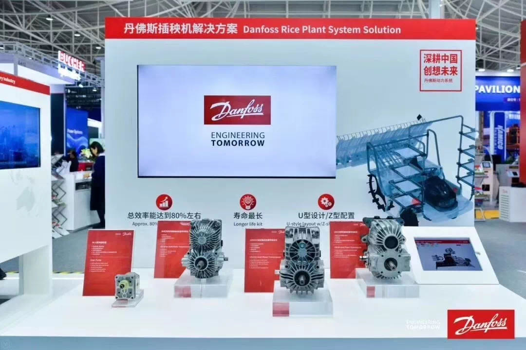 丹佛斯在水稻插秧机领域有多年的配套经验,展会展示的插秧机解决方案为U型设计/Z型配置,提供适用于4行、6行、8行不同马力段的紧凑型静液压驱动单元,总效率能达到80%左右,使用寿命也有了很大幅度的延续。